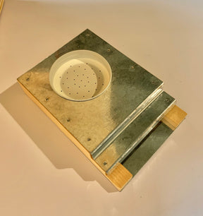 Traditional Entrance Feeder made of wood with a metal covering and a metal lid with pre-drilled holes. Item measures 4 1/2" wide by 6 1/2" long.